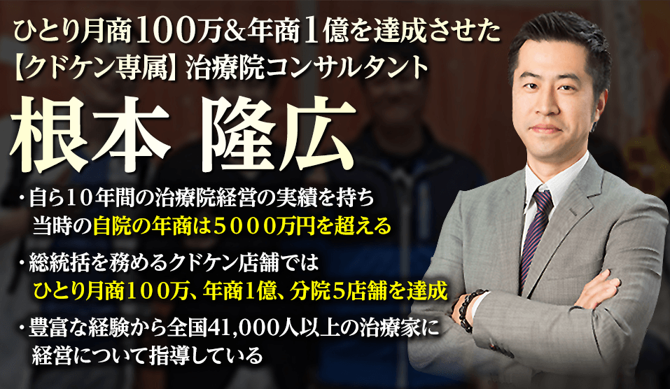 内容 | 訪問、電話、メールでのコンサルを主軸に、1対1の完全個別サポートの中でクドケンノウハウを踏襲した治療院経営ノウハウを全て伝授します。 あなたの院オリジナルの経営戦略、集客、リピート、フォローアップシステムを適切に構築します。 |
