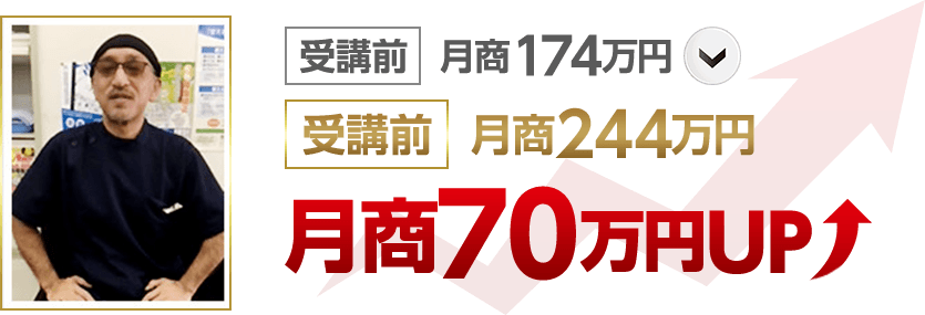 根本先生にコンサルを受けた後、一つひとつ実践を積み重ねた結果、翌月からジワジワ売り上げが伸び続け、3カ月でほぼ倍、そのまま着実に上がり続け、7カ月後には2.5倍の1、018、560円を達成することができました!!