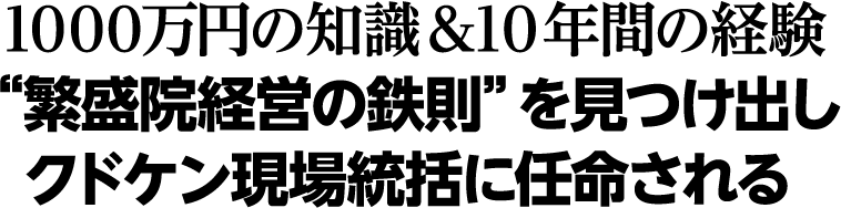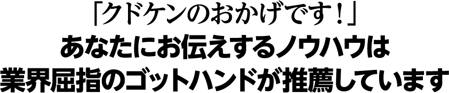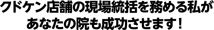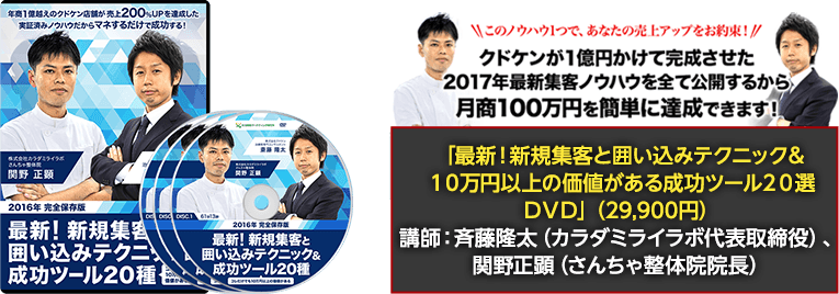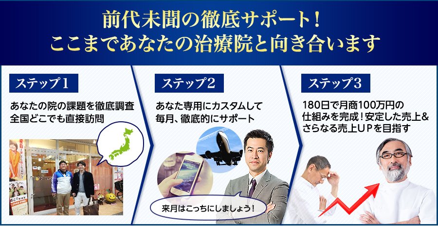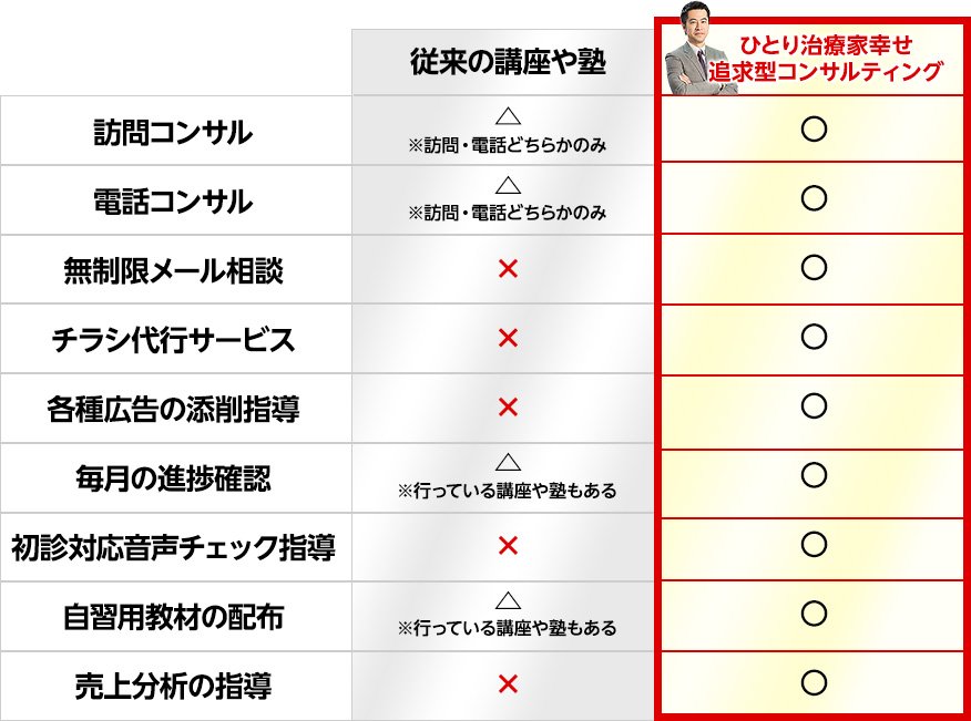 内容 | 訪問、電話、メールでのコンサルを主軸に、1対1の完全個別サポートの中でクドケンノウハウを踏襲した治療院経営ノウハウを全て伝授します。 あなたの院オリジナルの経営戦略、集客、リピート、フォローアップシステムを適切に構築します。 |