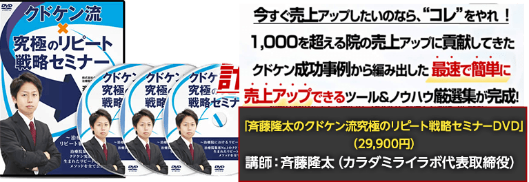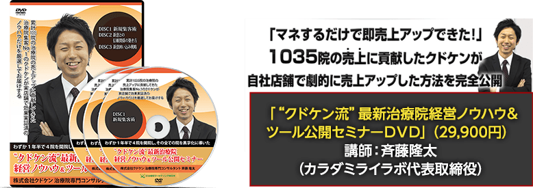 使い方が分からなければ私も説明しますし、クドケン直営院の女性スタッフによる『使用方法の解説動画』もあわせてプレゼントしておりますので、先生の理想の経営をクリアな状態で達成するためにも是非活用してください。